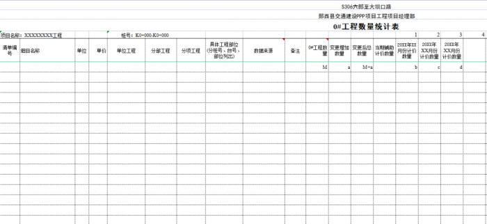 “0#”臺賬按單位、分部、分項工程劃分標準編制,可以將計量支付與質(zhì)量檢驗評定有機結(jié)合起來,這樣可以使質(zhì)檢、測量、實驗、計量等部門的內(nèi)業(yè)工作都在同一個規(guī)則下進行,提高了整個項目(合同段)內(nèi)業(yè)管理的效率。